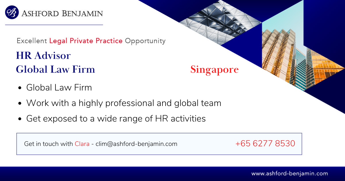 Ashford Benjamin is partnering with a global law firm on a HR Advisor opportunity. This is a great role for HR professionals with minimally 3-5 years of HR experience in private practice, who are independent and enjoy working in a fast-paced environment where you have the autonomy to run the HR function in Singapore, supported by the wider APAC team. This is a generalist HR position.