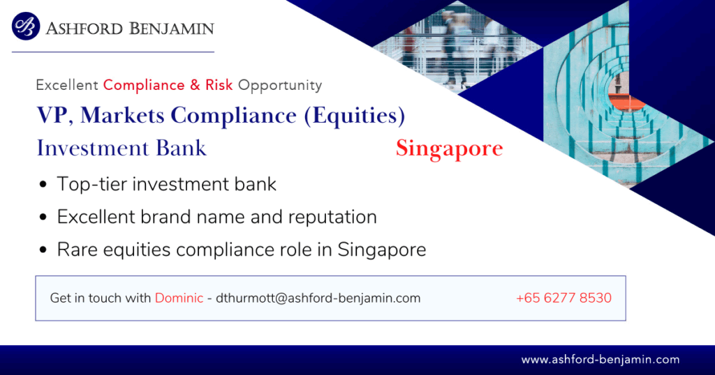 Ashford Benjamin are pleased to be partnering a global investment bank who are hiring within their Compliance team in Singapore. Our client is hiring for an Equities Compliance professional who will be responsible for compliance advisory, regulatory tracking, training, and surveillance. The jobholder will also manage regulatory enquiries, which requires the incumbent to have strong knowledge of MAS and SGX regulations. If this sounds like you, or if you’d like to find out more, please reach out to dthurmott@ashford-benjamin.com for a confidential discussion on the market.
